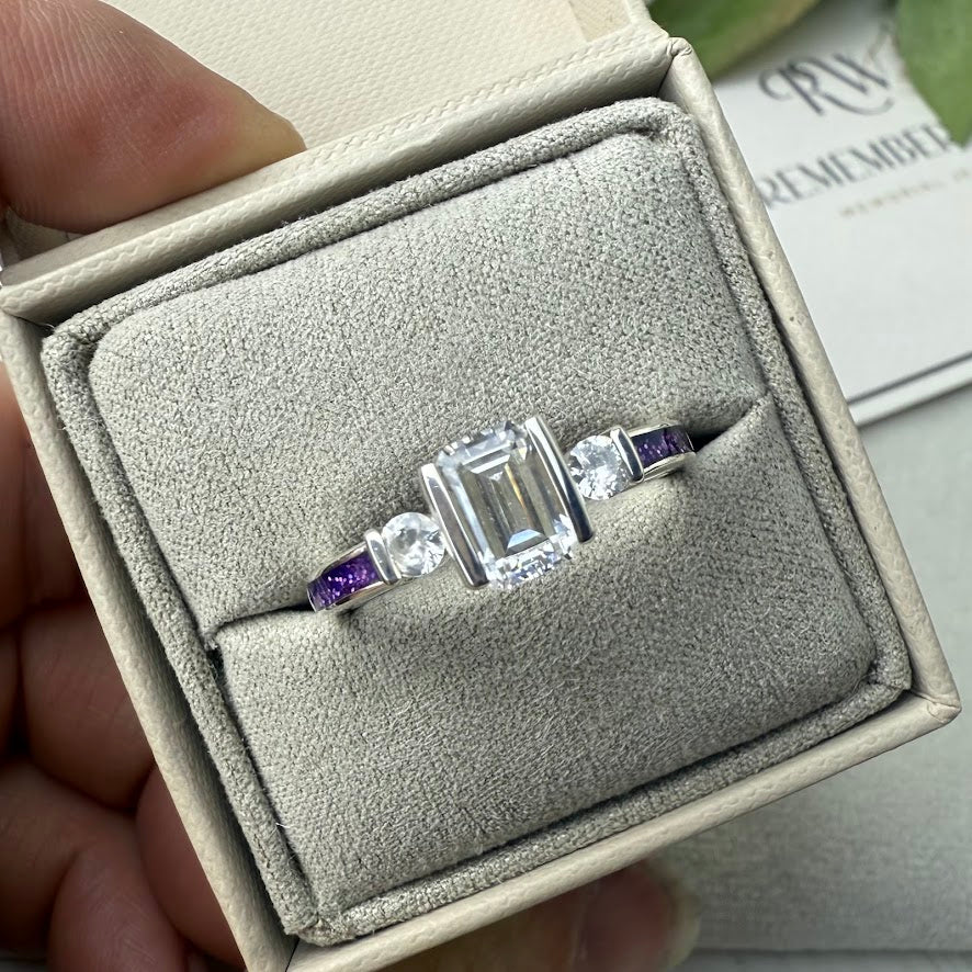 The Emerald Cut Solitaire Ring is crafted from premium .925 Sterling silver. Each piece can be customised to include sentimental keepsakes like ashes, hair, fur, or sand, in a variety of stunning colours.
