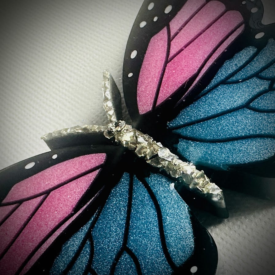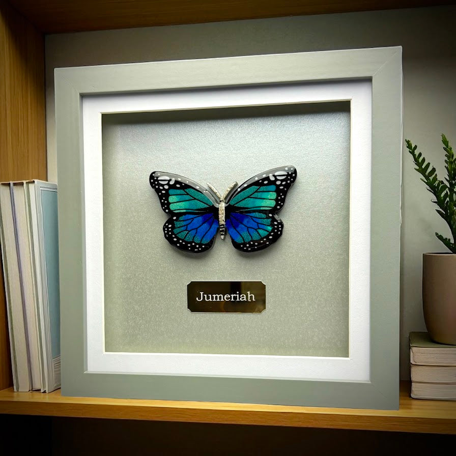 This elegant frame is specifically designed to hold a Butterfly that can contain ashes, hair, or fur. The frame is available in white, black or grey and includes a personalized name plaque. Frame measures 20 x 20cm. The Butterfly can be made in any colours