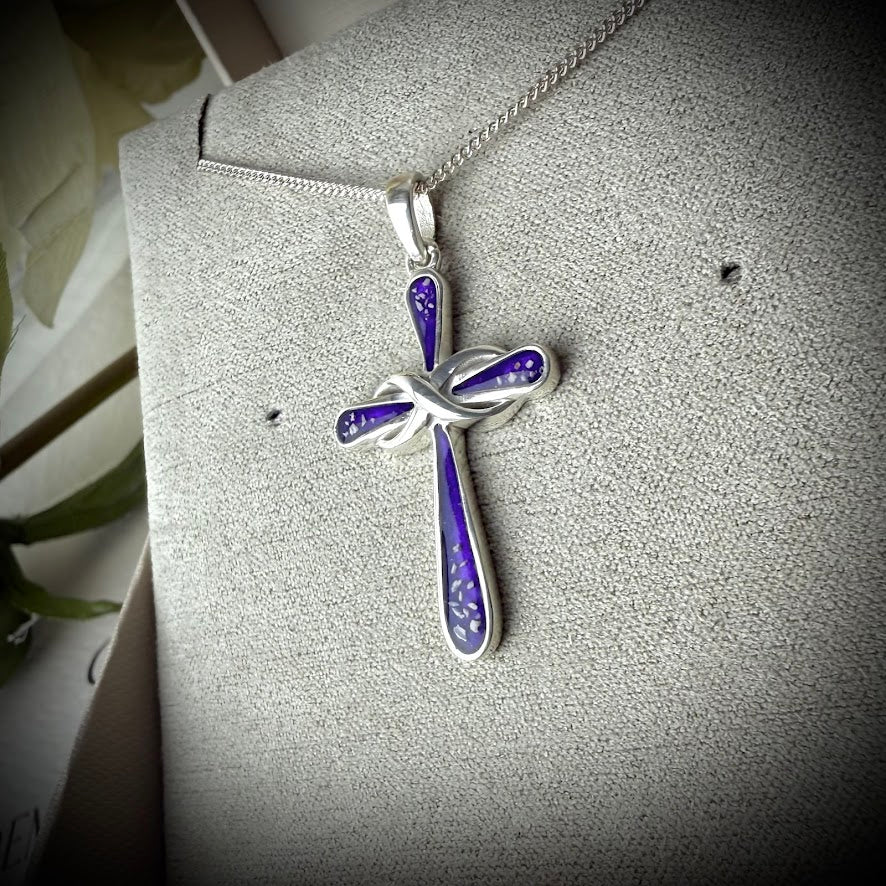This .925 Sterling Silver Infinity Cross Pendant includes a 16, 18, or 20" chain in your choice of two styles: plain or twisty. It can also be customised to hold cherished memories, such as ashes, hair, or sand, in a variety of colours. Measures 30 x 20mm