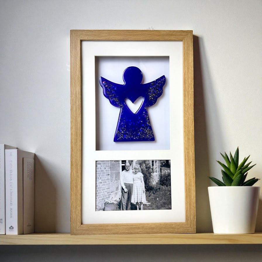 This elegant frame is specifically designed to hold a photograph of your loved one, along with an Angel on the opposite side that can contain ashes, hair, or fur. The frame is available in dark oak, light oak, grey, or black with a white or black card background, and includes a personalised name plaque. It can be hung landscape or portrait. The Angel can be made in a variety of colours