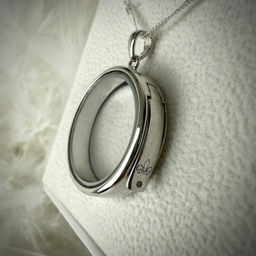 This floating glass and Sterling silver floating locket belongs to the Hot Diamonds "Anais" collection and comes with a sterling silver Paw charm that can contain your loved ones ashes or hair in a range of colours. The locket opens with a stunning side hatch which holds a small diamond. It includes a choice of 16, 18, or 20-inch chains in two styles: plain or twisty. This comes complete with Luxury hot Diamonds gift packaging which is truly stunning. Measures 25mm x 25mm.