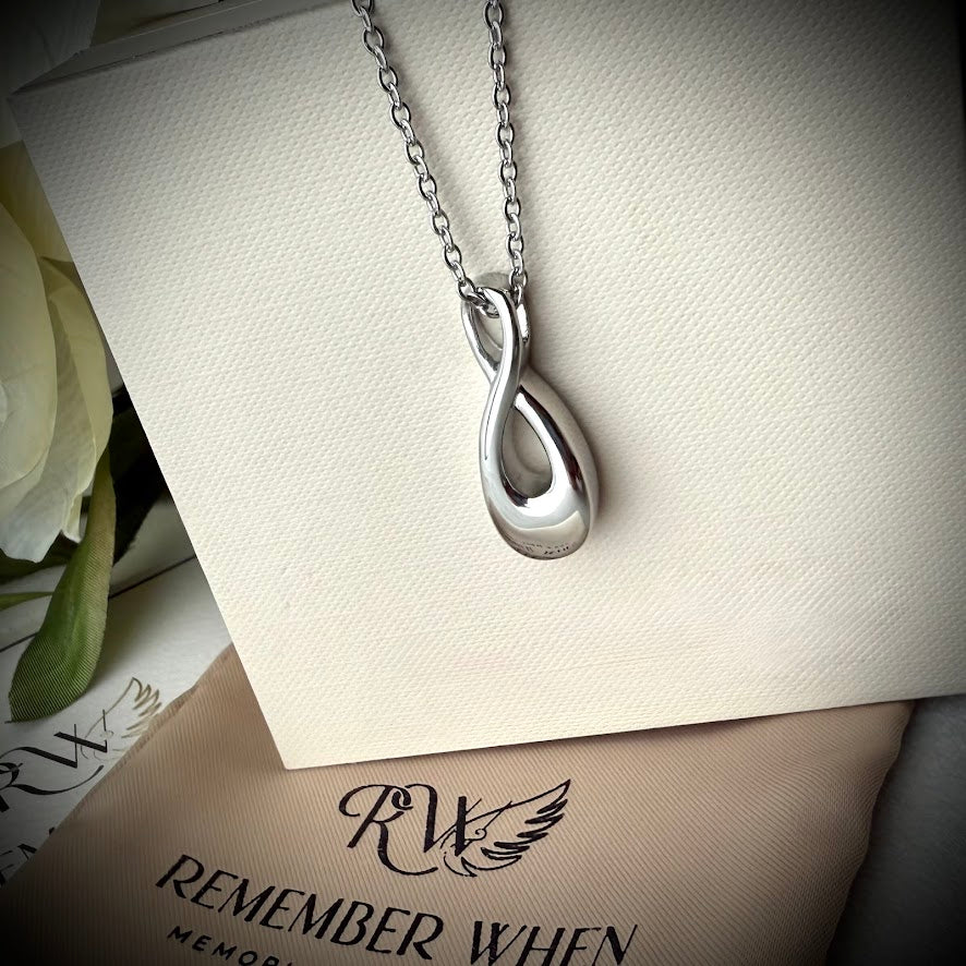 The Self Fill Infinity Urn Pendant is a convenient option for those who prefer not to send ashes through the Post. Made from Stainless steel, it can hold a token amount of ashes. The pendant comes with a 19.5" chain, a funnel for easy filling, and instructions, as well as a gift pouch.