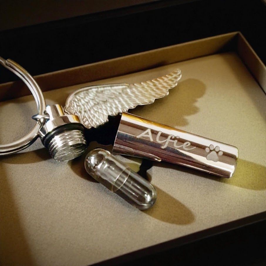 The Self Fill winged Urn Keyring is a convenient option for those who prefer not to send ashes through the Post. Made from Stainless steel, it can include complimentary engraving and can hold a token amount of ashes. The keyring come with a funnel for easy filling, and instructions, as well as a gift pouch.