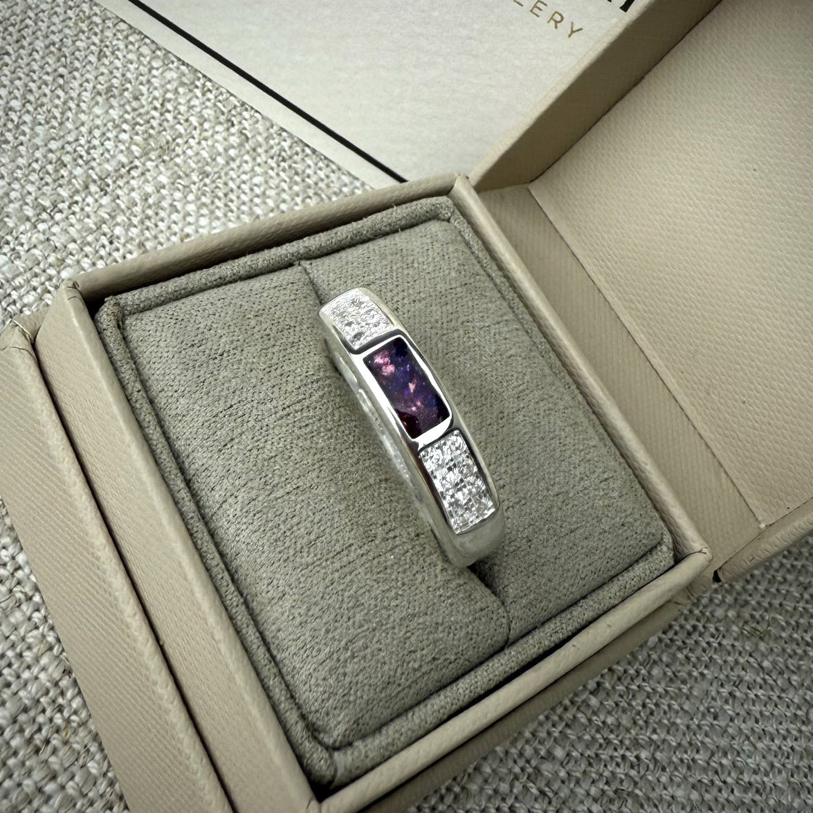 The Amore Ring is crafted from premium .925 Sterling silver and CZ stones. Each piece can be customised to include sentimental keepsakes like ashes, hair, fur, or sand, in a variety of stunning colours.