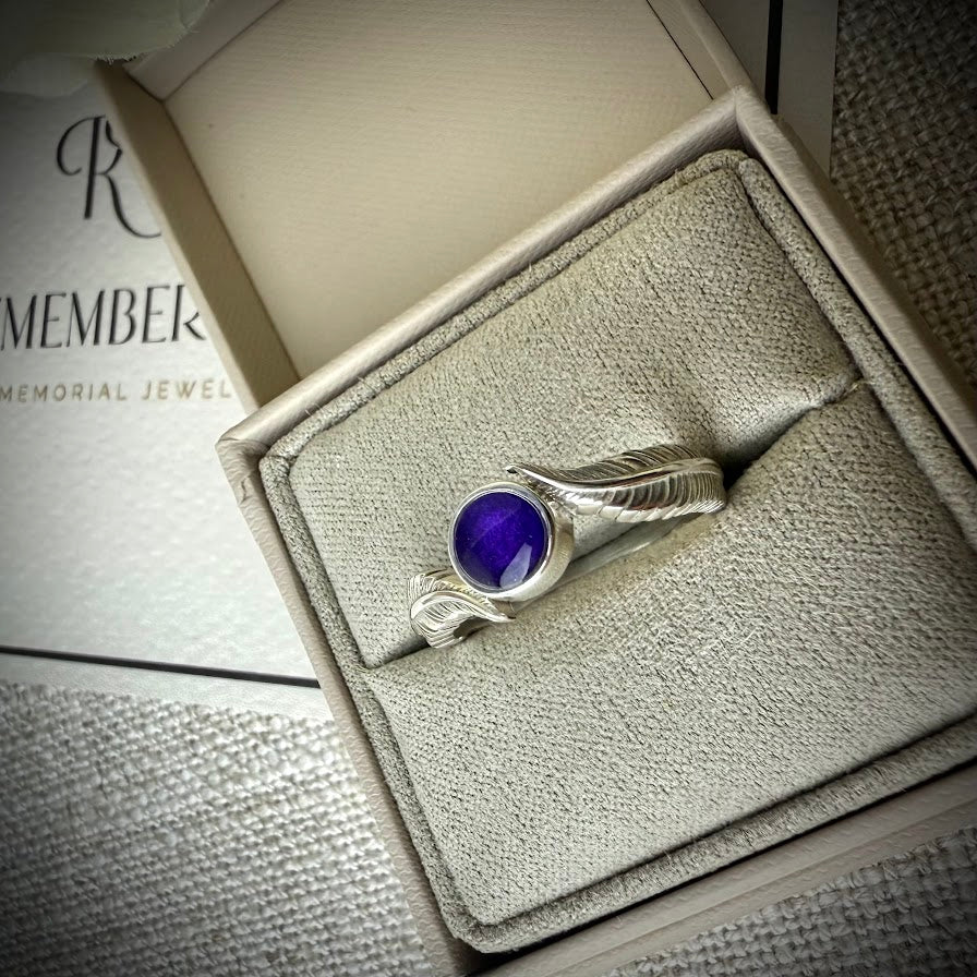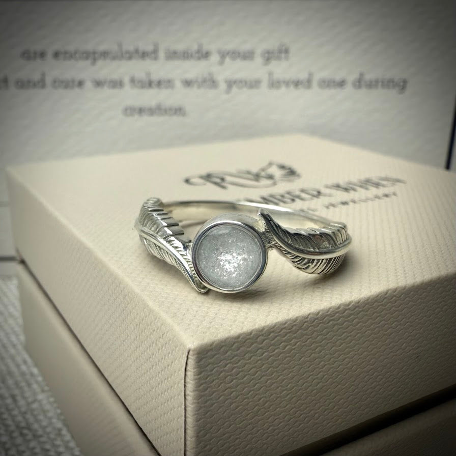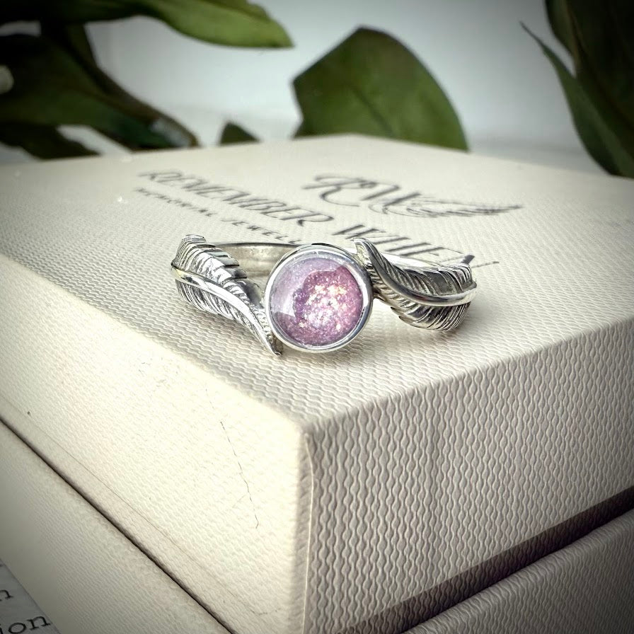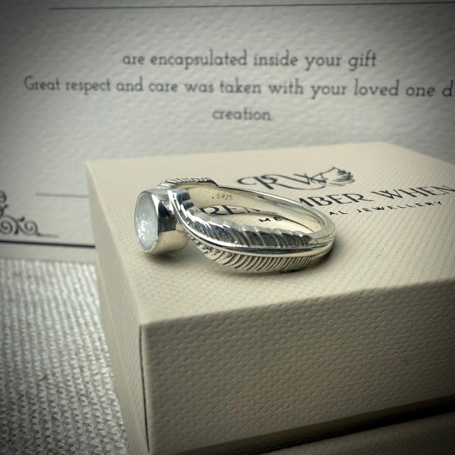 The When Feathers Appear Ring is crafted from premium .925 Sterling silver. Each piece can be customised to include sentimental keepsakes like ashes, hair, fur, or sand, in a variety of stunning colours.