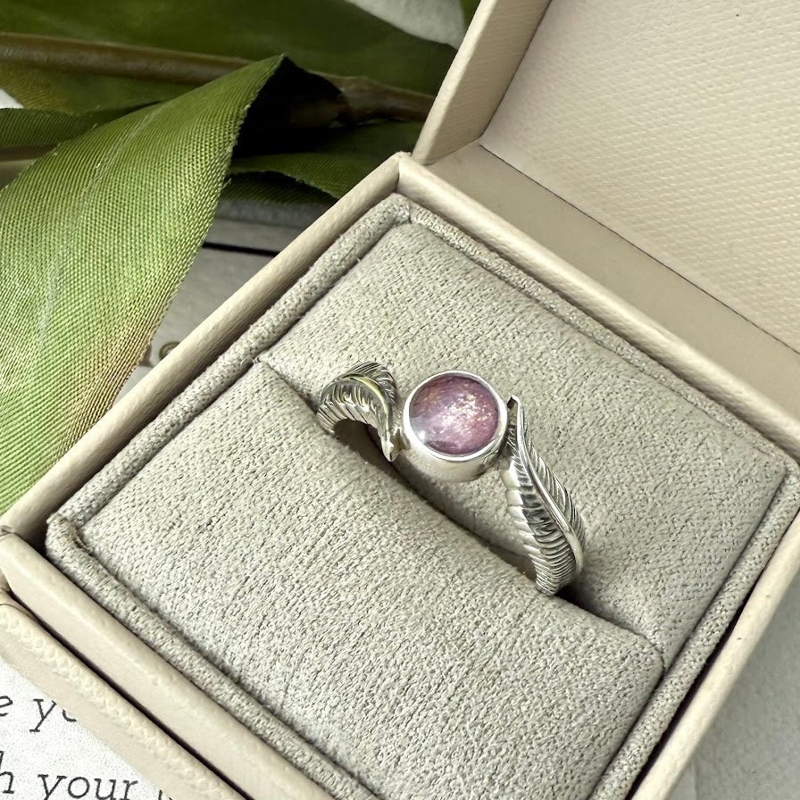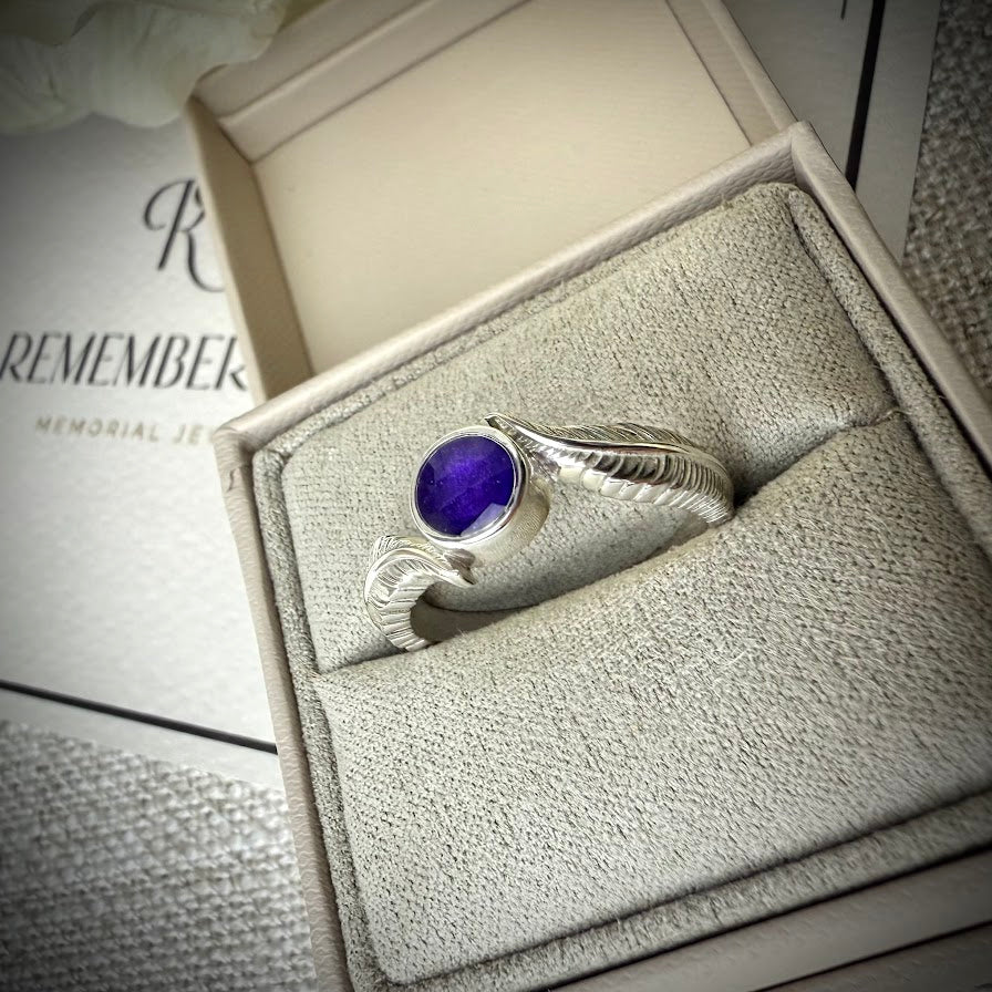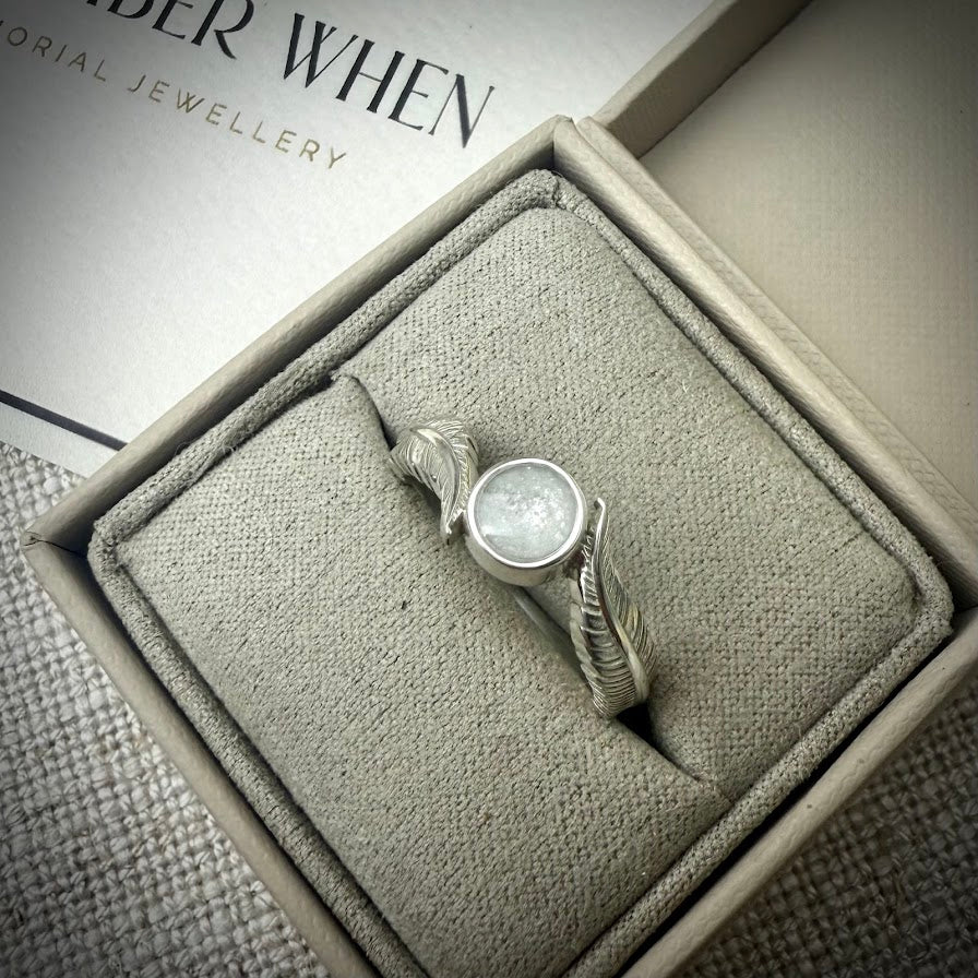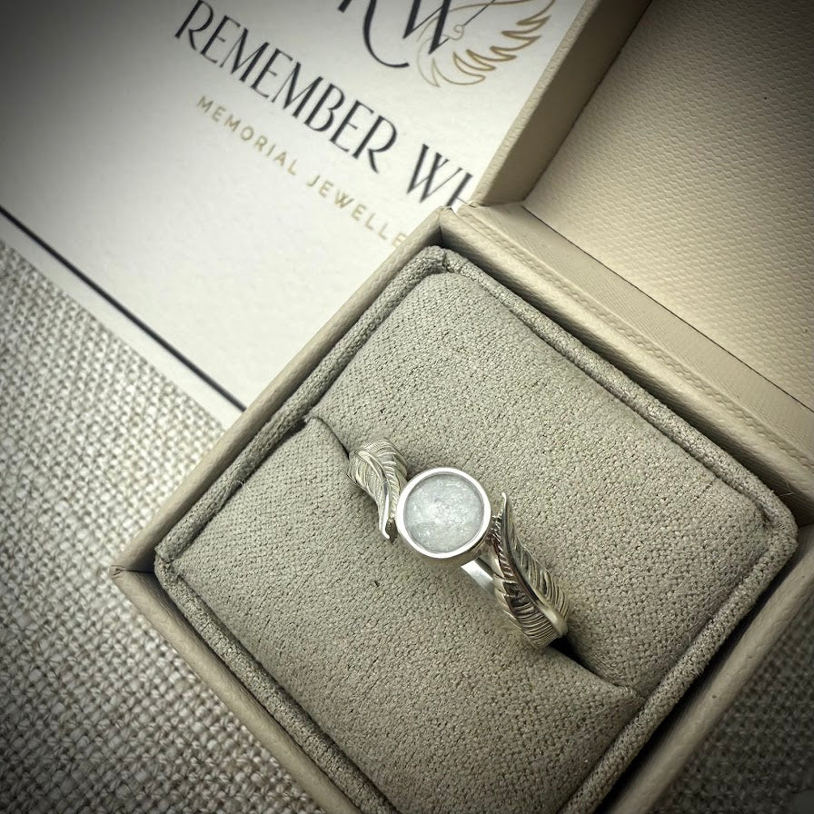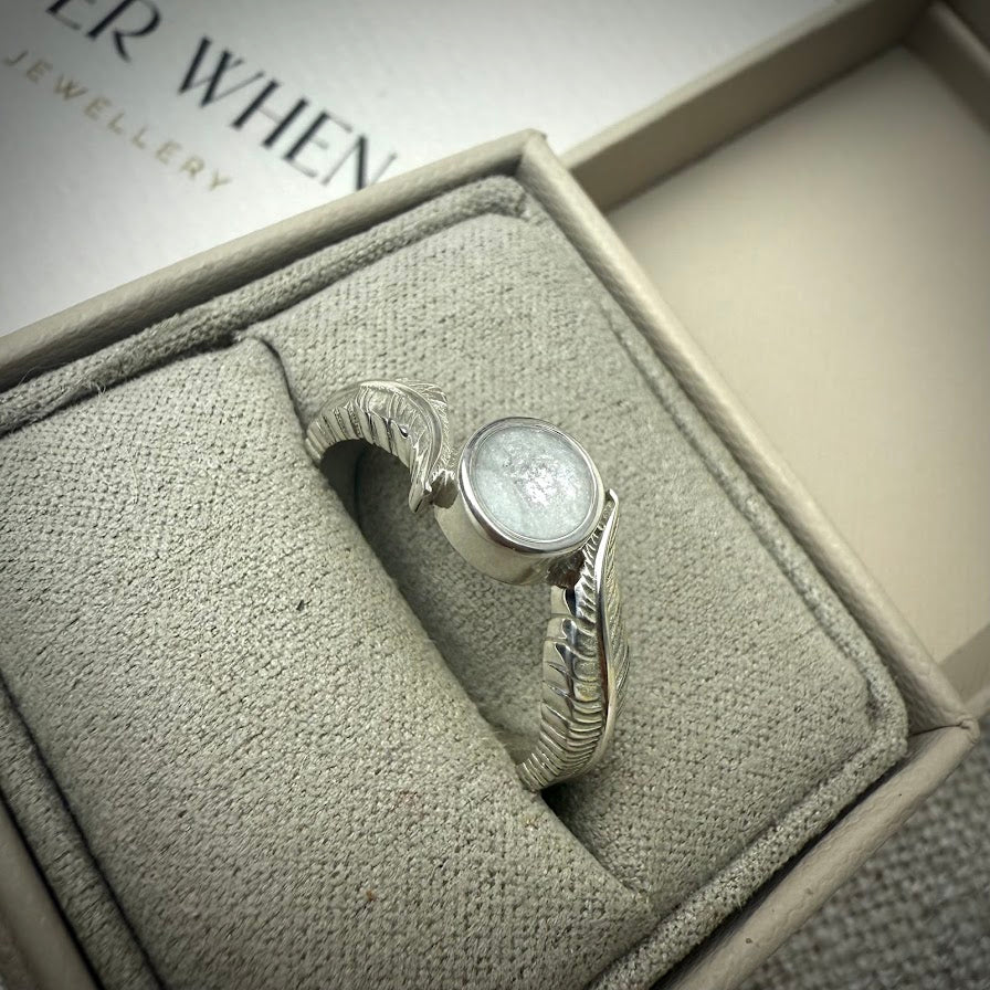 The When Feathers Appear Ring is crafted from premium .925 Sterling silver. Each piece can be customised to include sentimental keepsakes like ashes, hair, fur, or sand, in a variety of stunning colours.